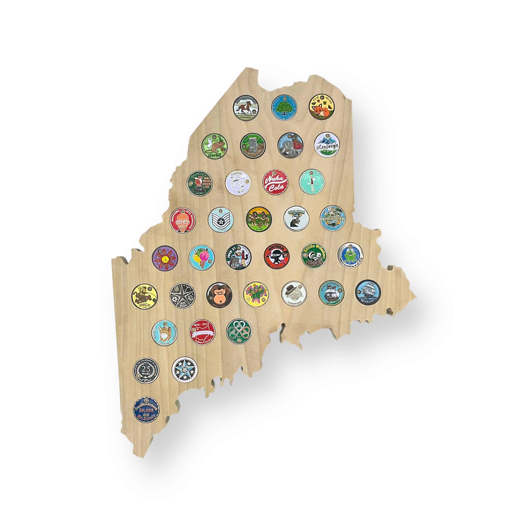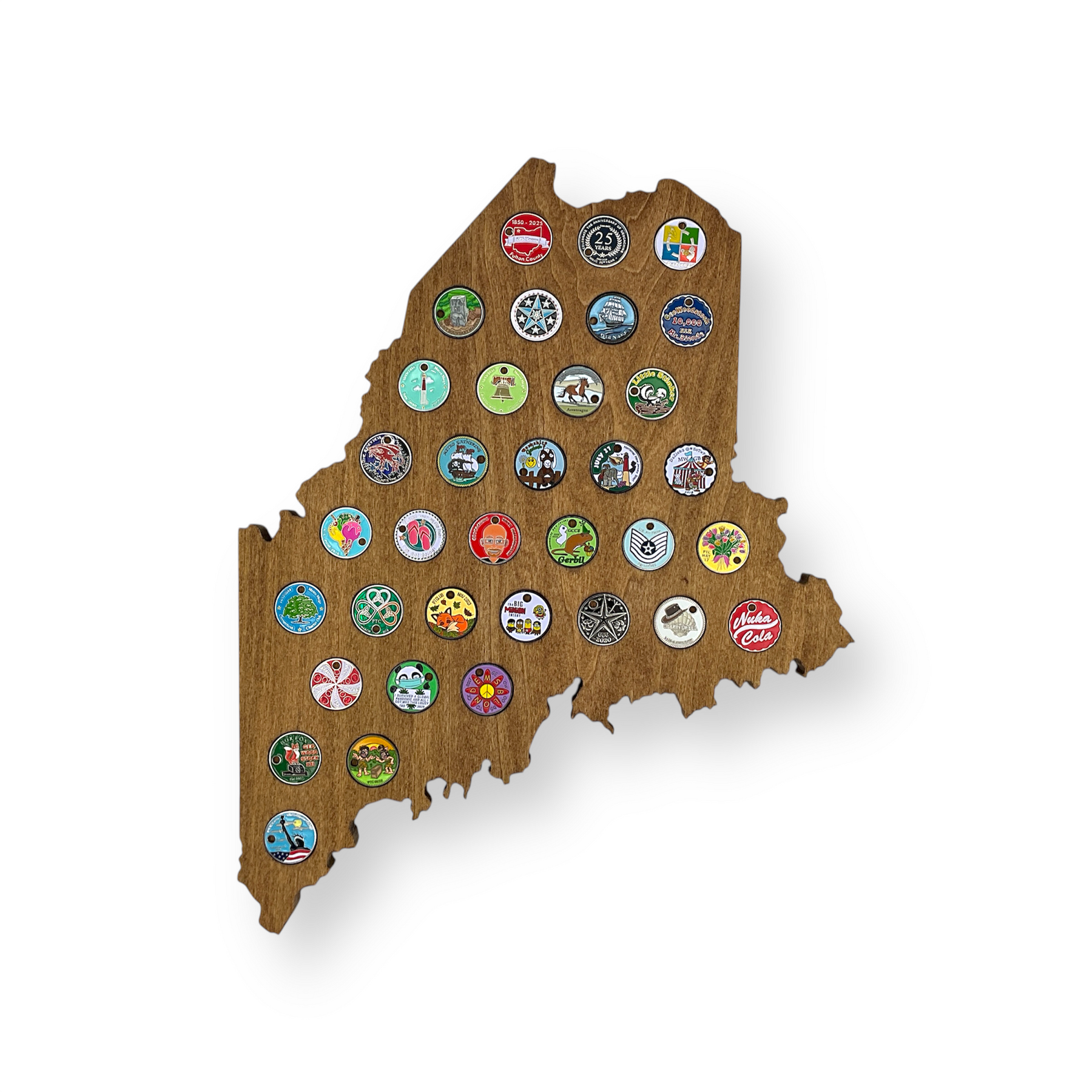 Your favorite pathtags will be on display for all to see with this solid poplar Maine state outline wall art!