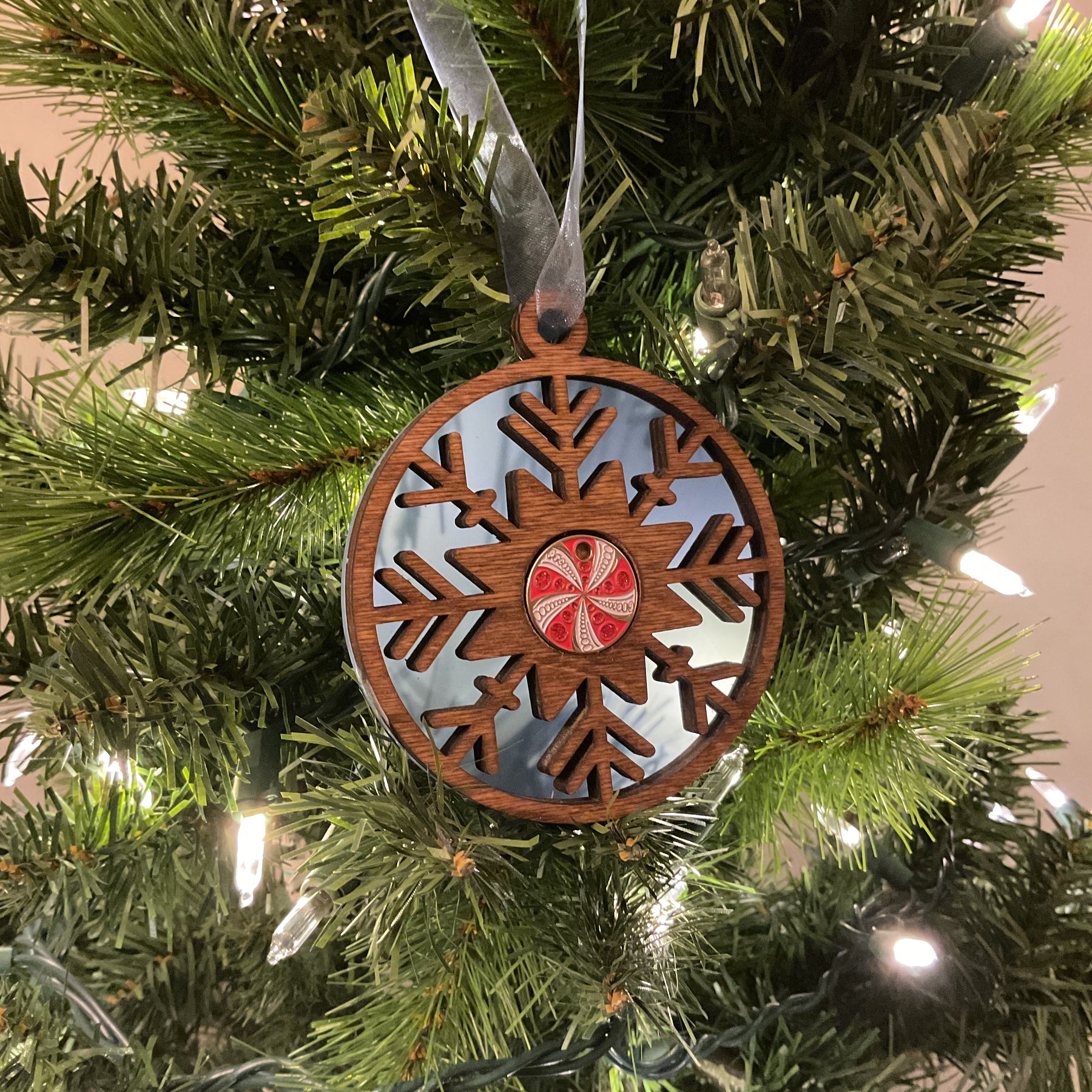 This ornament features a space to hold a single standard size round pathtag or flashtag (23mm).